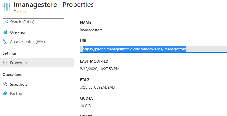 - Let's also jump into the File Share and take note of the URL of the File Share. This can be found in the Properties of your File Share and will be in the format of {storageaccountname}.file.core.windows.net/{sharename}
