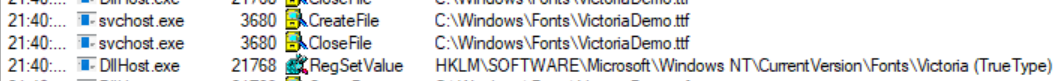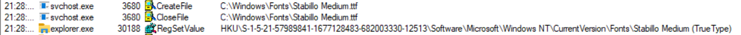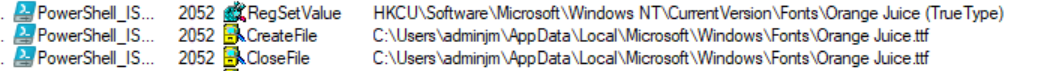 After cutting out most of the noise we are left with the three entries above. We can see that the font is copied to the Appdata folder but there is also a registry value created in the users registry hive.